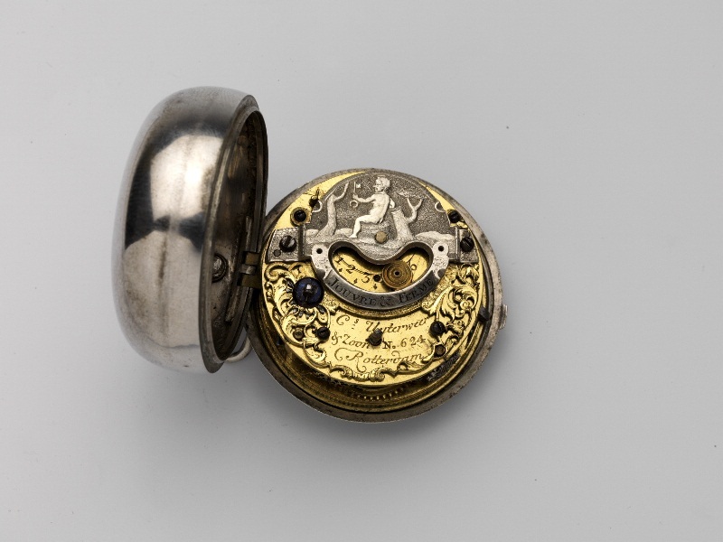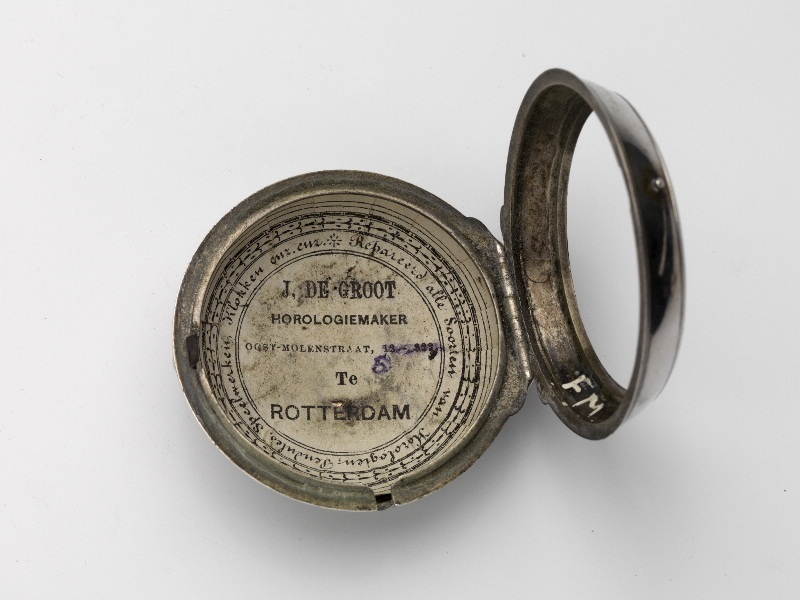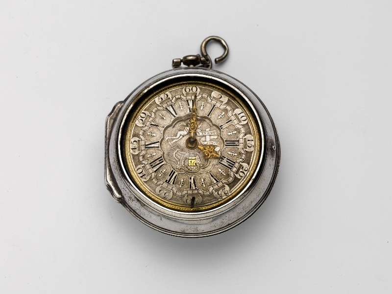 Zilveren horloge met losse buitenkast en zilveren wijzerplaat