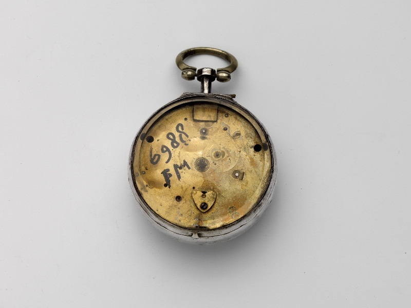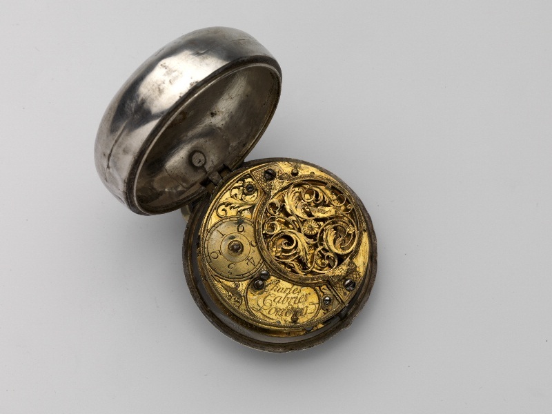 Zilveren horloge met losse buitenkast waarop een mythologische voorstelling