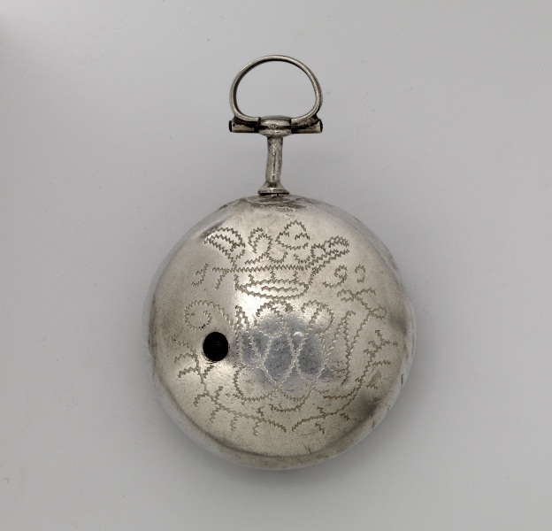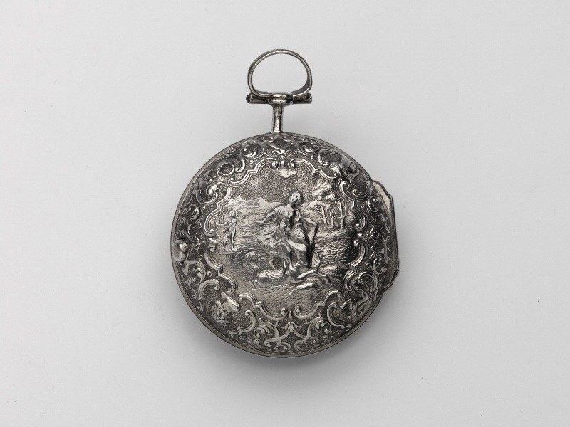 Zilveren horloge met losse buitenkast waarop een mythologische voorstelling