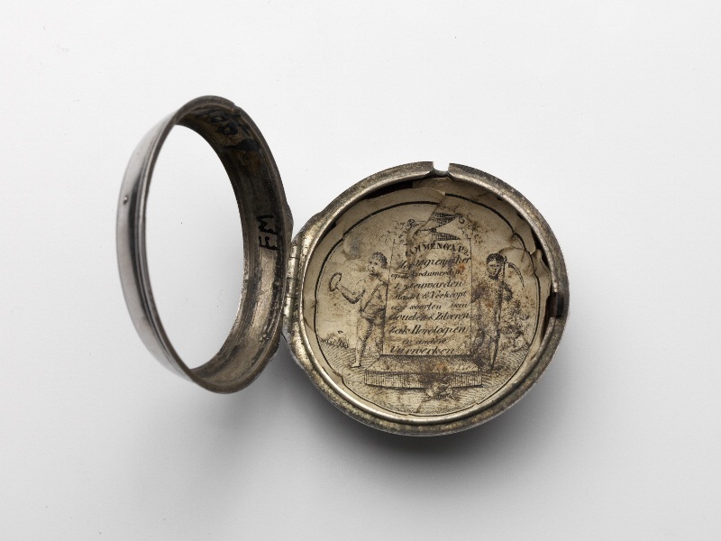 Zilveren horloge met zilveren buitenkant en op het uurwerk een gegraveerde wijzerplaat