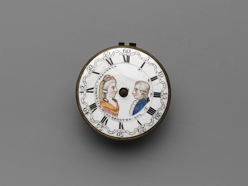 Rond horloge met gekleurd emaille wijzerplaat, in het midden de buste-portretten in kleur van Princes Sophia Wilhelmina Frederika van Pruisen en Prins Willem de Vijfde