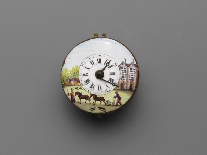 Rond horloge met gekleurde emaille wijzerplaat, in brede rand eromheen in kleur emaille, rechts huizen en een ploegende boer