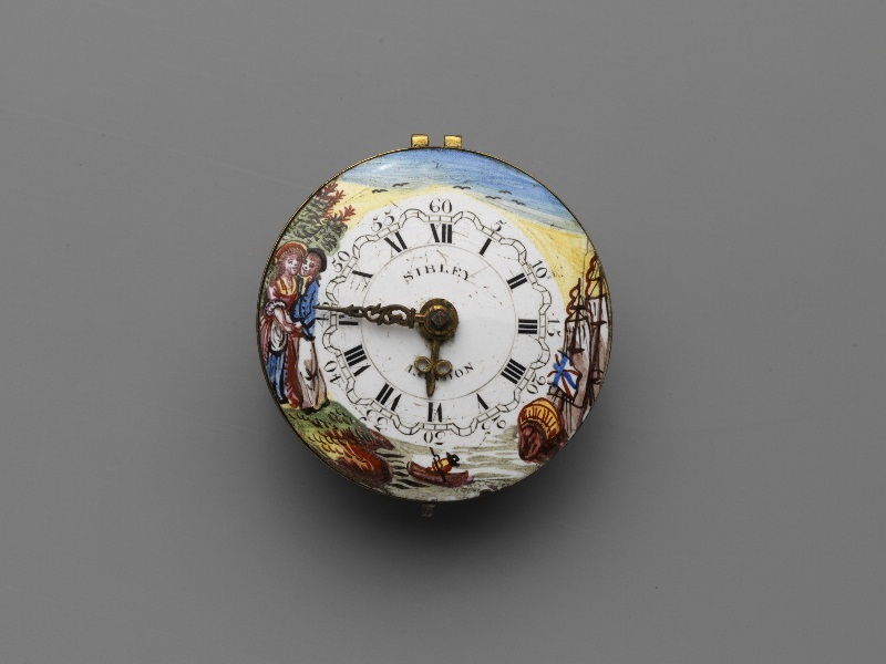 Engels horloge met gekleurde rand, waarop een driemaster met Engelse vlag, een man in roeibootje en een liefdespaartje