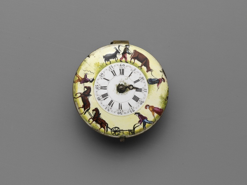 Engels horloge met gekleurde rand en ploegende landbouwers