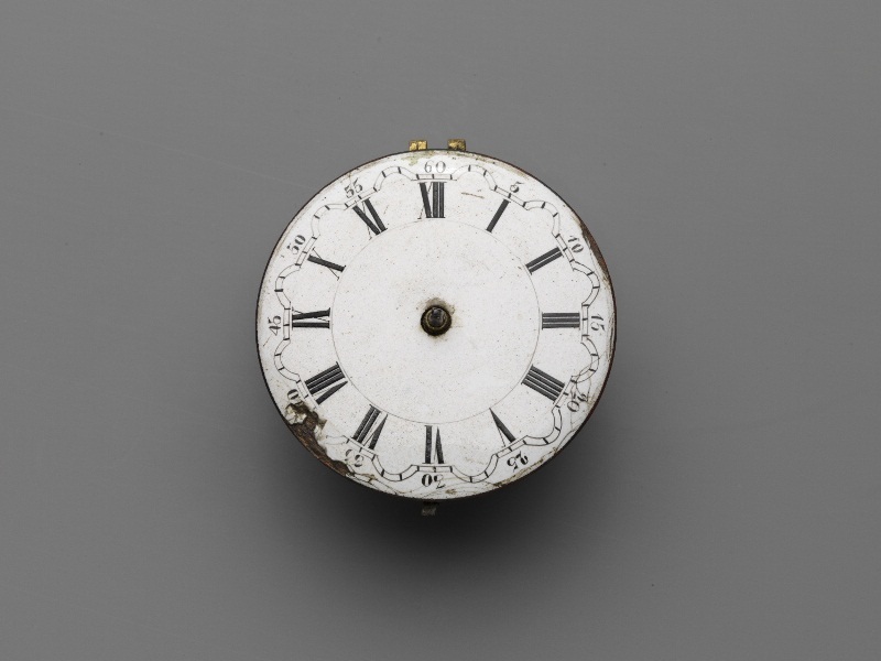 Rond uurwerk met wit geëmailleerde wijzerplaat, waarop tijdaanwijzing in zwarte Romeinse en Arabische cijfers