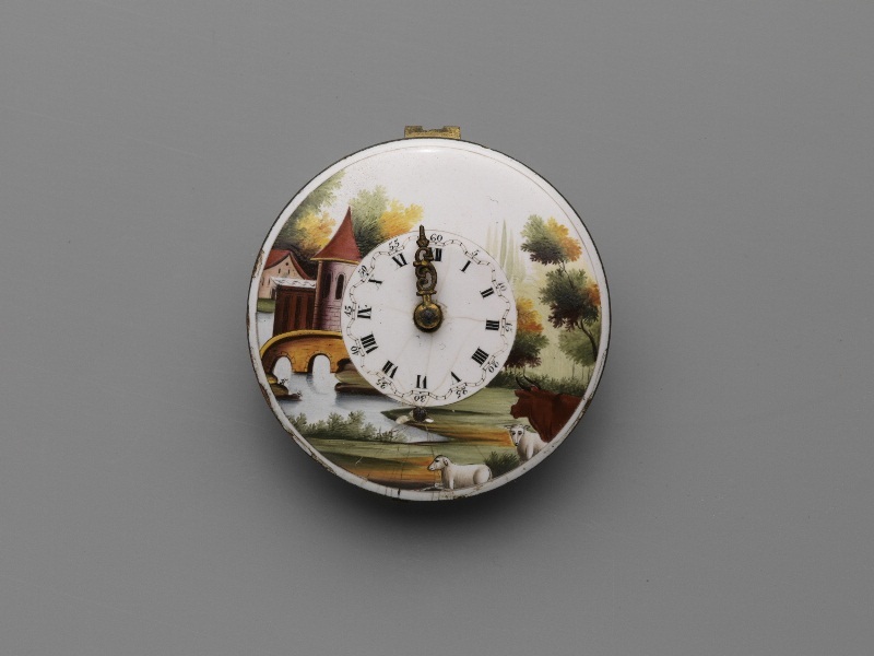 Rond horloge met gekleurd emaille wijzerplaat waarop een landschap met een kasteel