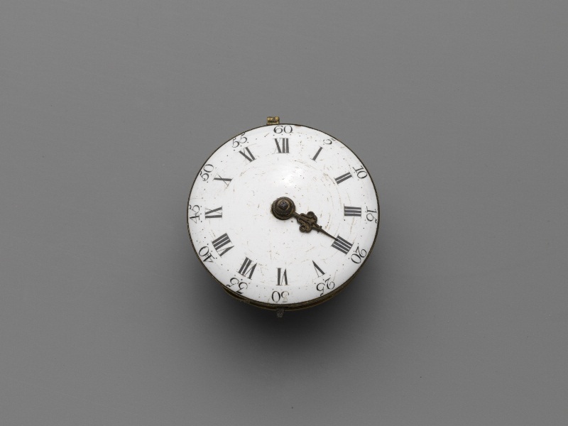 Rond horloge met wit geëmailleerde wijzerplaat, waarop in zwart de tijdaanwijzing in Romeinse en Arabische cijfers