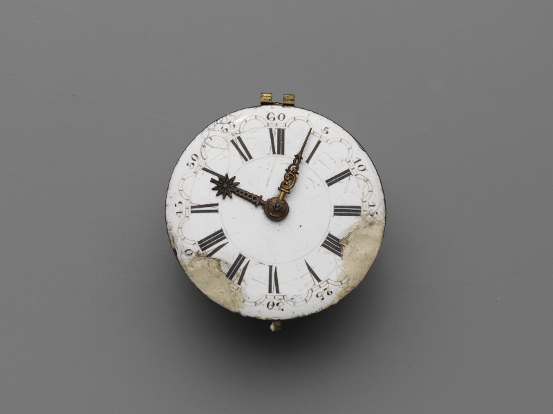 Rond horloge met witte emaille wijzerplaat, waarop in zwart de tijdaanwijzing in Romeinse en Arabische cijfers