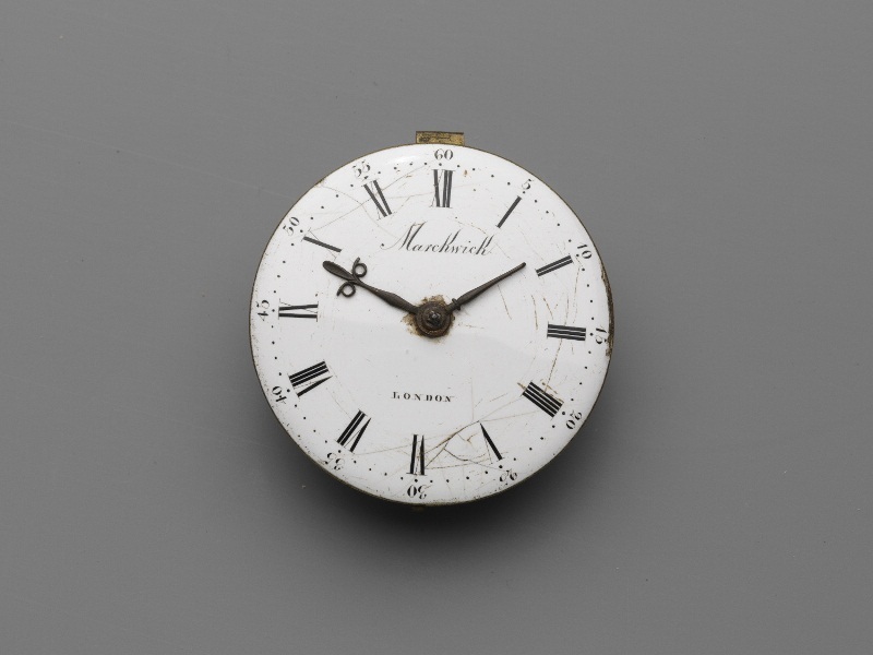 Rond horloge, wit geëmailleerde wijzerplaat waarop tijdaanwijzing in zwart Romeinse en Arabische cijfers