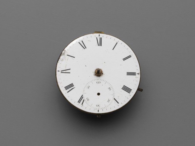 Rond horloge met wit emaille wijzerplaat waarop in zwart de tijdaanduiding in Romeinse cijfers