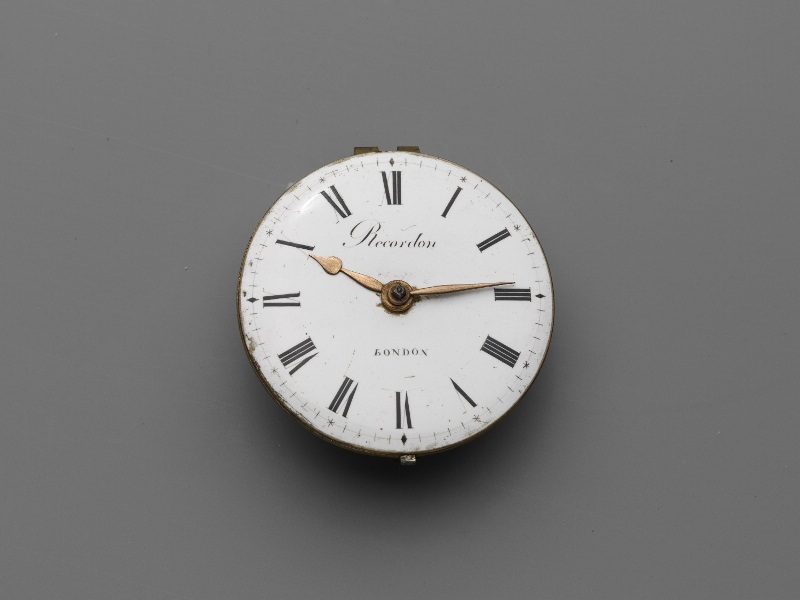 Rond horloge met wit geëmailleerde wijzerplaat, waarop in zwart de tijdaanduiding in Romeinse cijfers