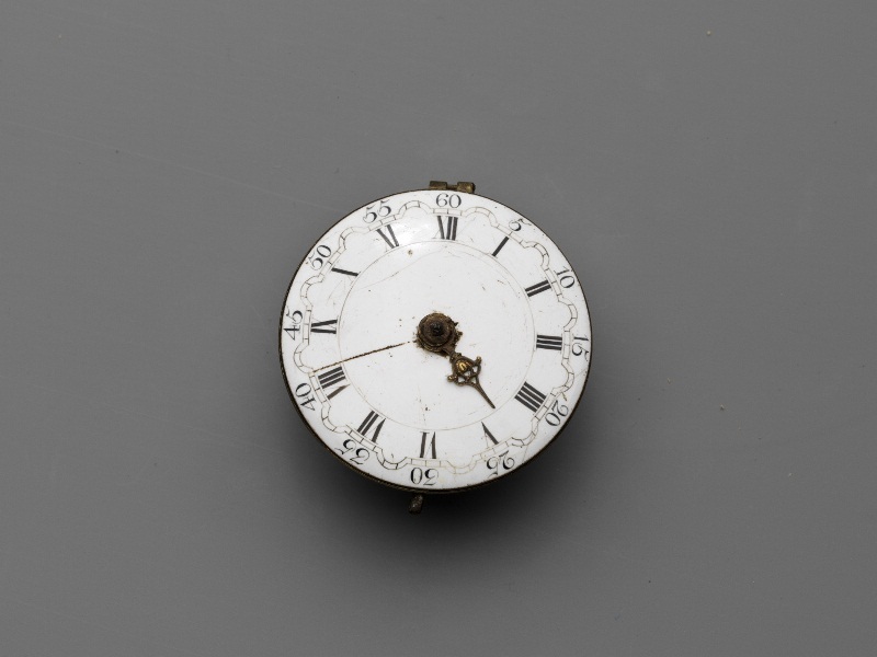 Rond horloge met witte geëmailleerde wijzerplaat, waarop in zwart de tijdaanwijzing in Romeinse en Arabische cijfers