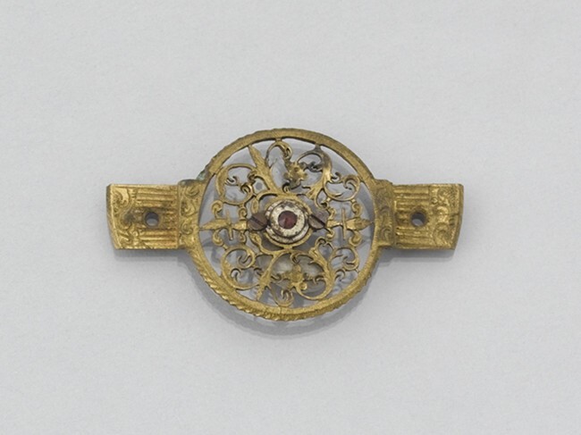 Ajour horlogekloof van verguld koper met twee zijstukken