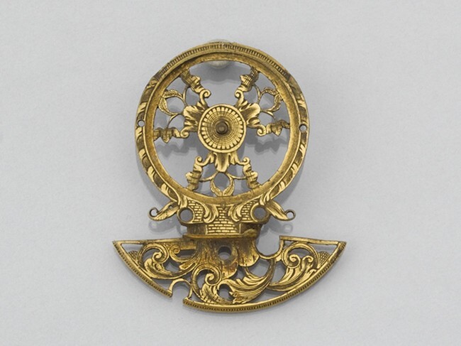 Ajour horlogekloof van verguld koper, opengewerkt, versierd met arabesken en krulwerk