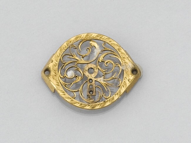 Ajour horlogekloof van verguld koper met fraaie krulversiering