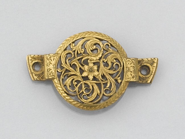 Ajour horlogekloof van verguld koper met twee zijstukken, krulwerk met bloempje in het centrum