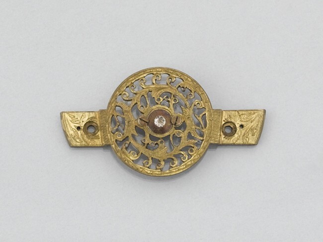 Ajour horlogekloof van verguld koper met twee zijstukken
