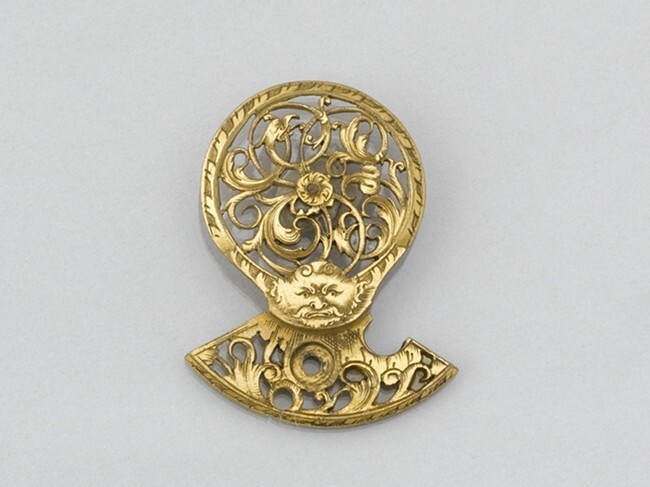Ajour horlogekloof van verguld koper met zijstuk versierd met krulwerk en gegraveerde mascarons