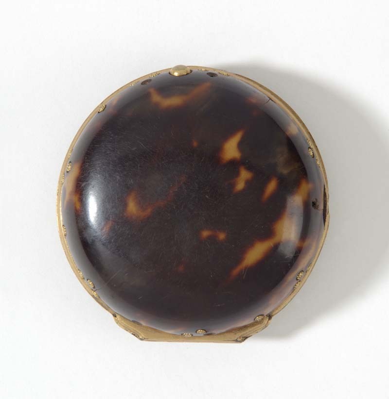 Licht bolvormig ronde horlogekast met frame van verguld koper, bekleed met schildpad, rondom versierd met vergulde nageltjes