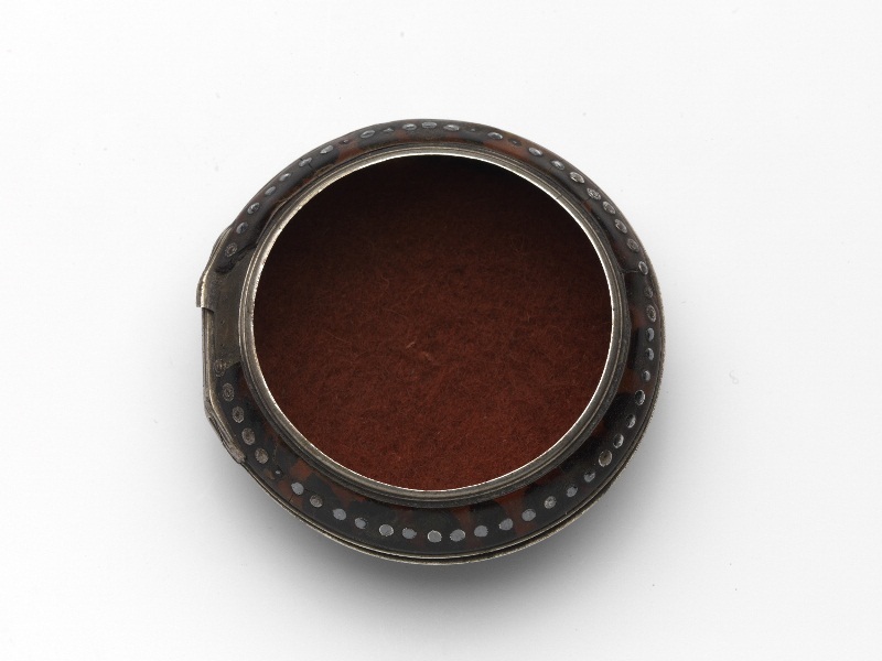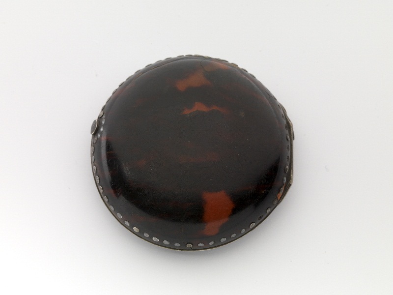 Platte ronde horlogekast, bekleed met schildpad en rondgaande versiering van zilveren nageltjes