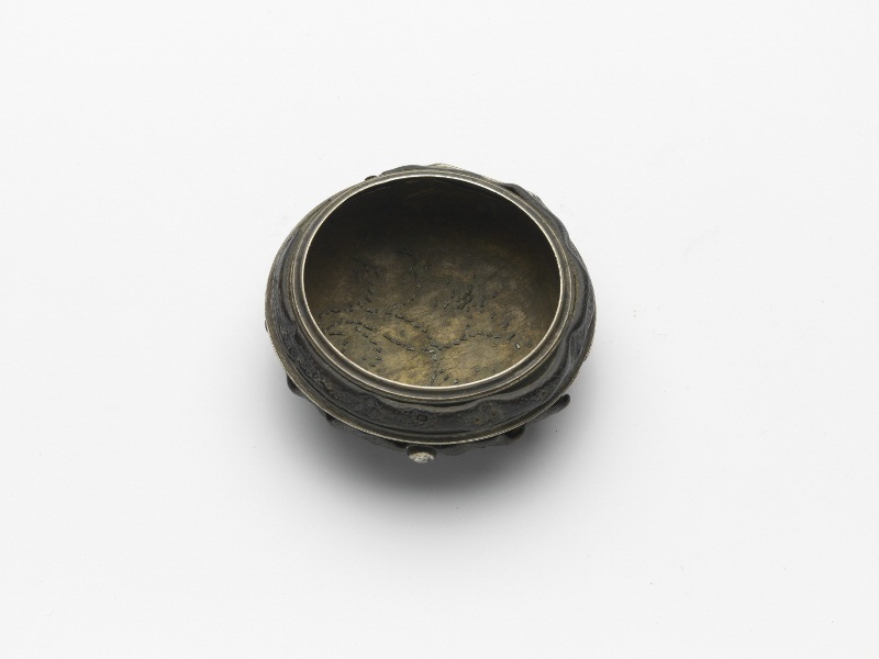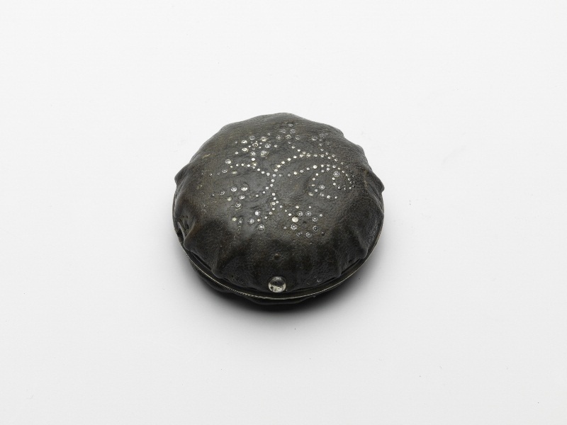 Afgeplat ronde horlogekast met scharnierend deksel, bekleed met robbevel, waarop versiering van bloemen door middel van zilveren nageltjes
