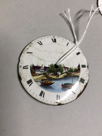 Ronde gekleurd emaille wijzerplaat, in het midden een dorpsgezicht met twee trekschuiten