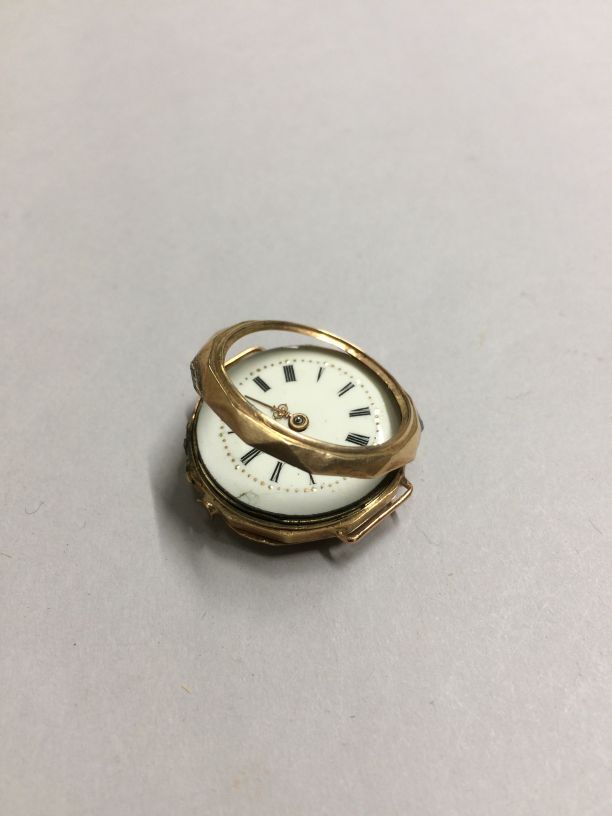 Gouden kast van dameshorloge waarvan de plaat is en zonder glas