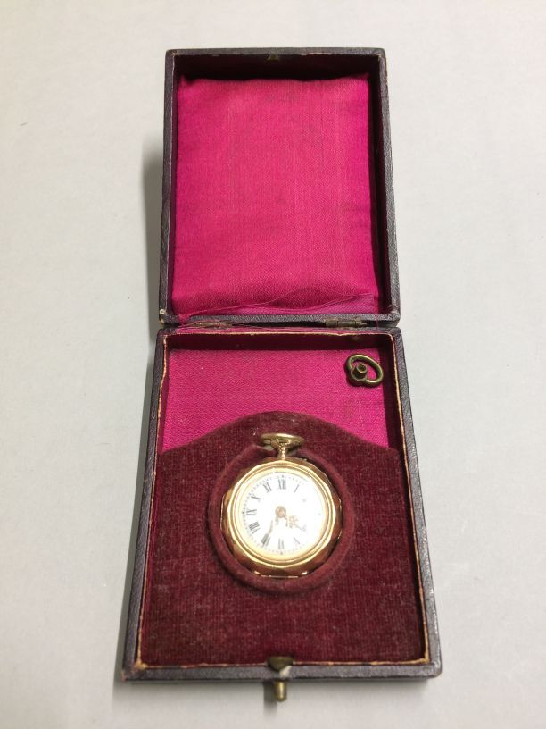 Gouden horloge in rood met zwart doosje in doosje ligt losse ring van ander horloge