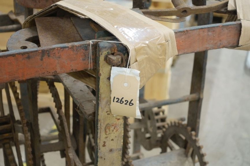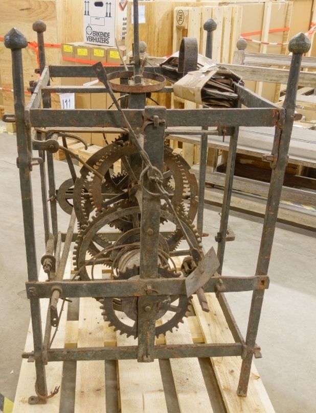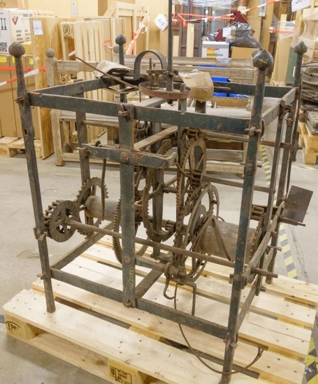 Torenuurwerk zonder klok, onderdeel van torenuurwerk zonder klok met twee bijbehorende gewichten