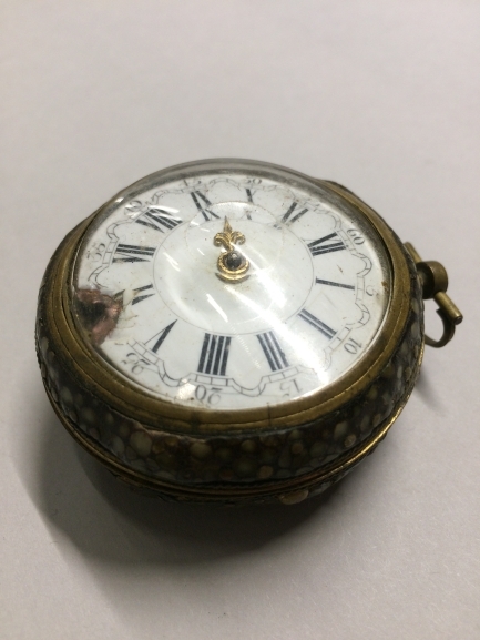Horloge met email wijzerplaat waarop Romeinse cijfers, daaromheen een kast van haaienvel
