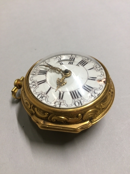 Gouden horloge met gouden kast, versierd met een gedreven mythologische voorstelling