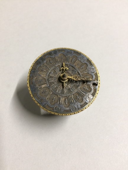 Rond horloge met zilveren wijzerplaat met daarop in niello-techniek de tijdaanwijzing in Romeinse en Arabische cijfers