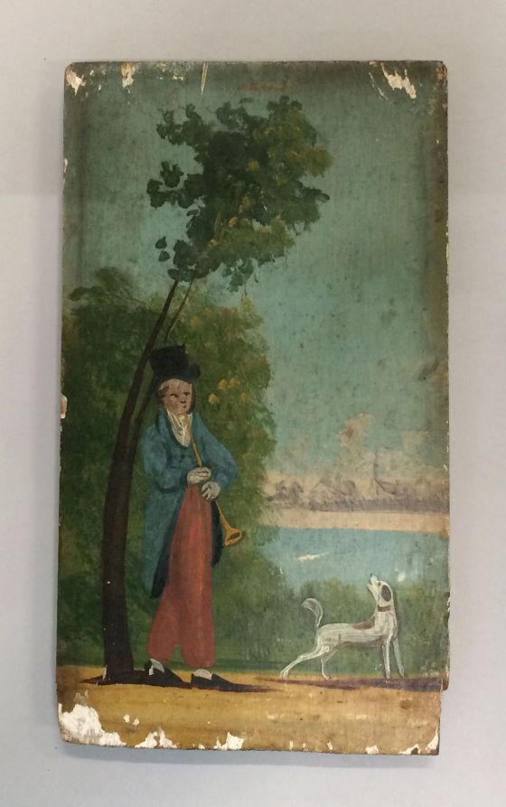 Een van twee langwerpig rechthoekige plankjes, beschilderd met een fluitspelende man onder een boom