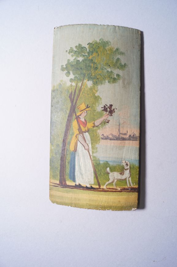 Een van twee langwerpig rechthoekige eiken plankjes, aan de voorzijde beschilderd met twee verschillende schilderingen