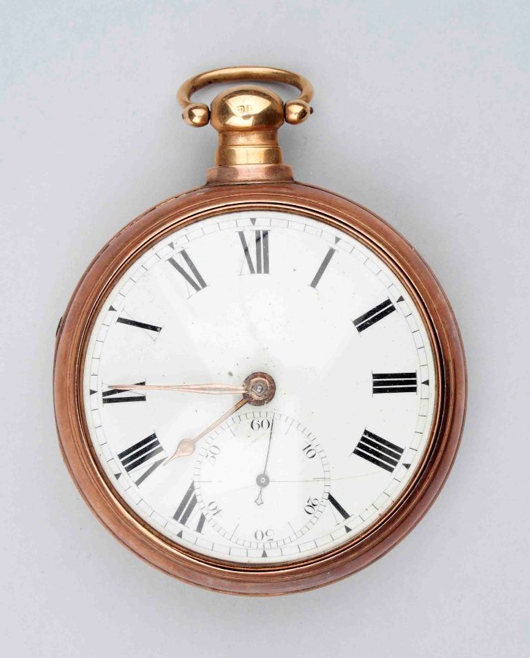 Gouden horloge met gouden kast en wit emaille wijzerplaat op koper waarop zwarte Romeinse cijfers en gouden wijzers.