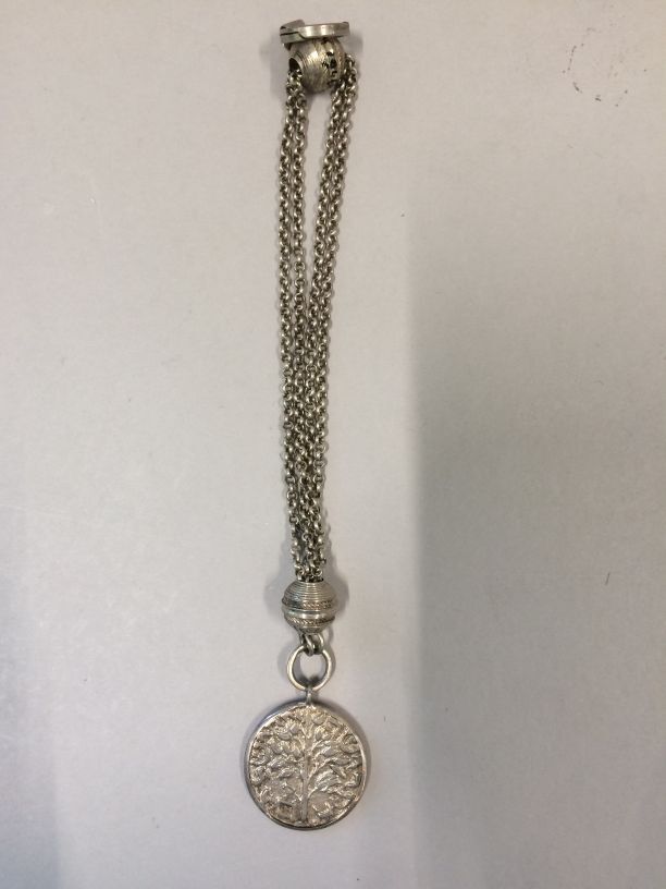 Sieraad bestaande uit achtereenvolgens door elkaar geslagen metalen ringen (schalmen), dienend om iets aan vast te leggen of mee te bevestigen. (ABR) https://data.cultureelerfgoed.nl/term/id/cht/e32bb6b7-0c48-40b1-bf56-284a07b31762