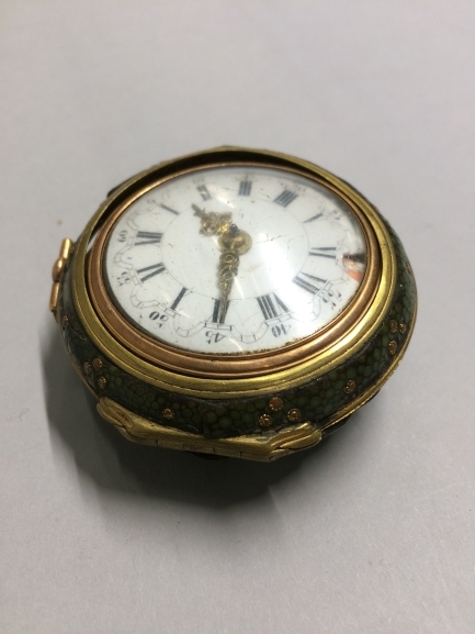 Gouden horloge in gedreven gouden kast waaromheen groen haaievellen kast