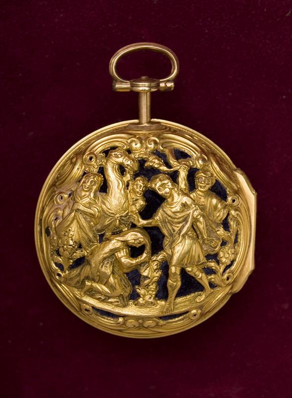 Engels horloge met losse kast opengewerkt met Bijbelse voorstelling van Isaäc en Rebecca