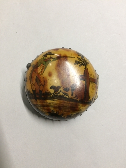 Losse horlogekast met hoorn waarop in polychroom een jager met een geweer die een vogel schiet