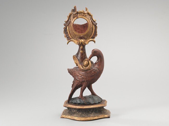 Houten horlogestandaard in de vorm van een vogel op een voetstuk