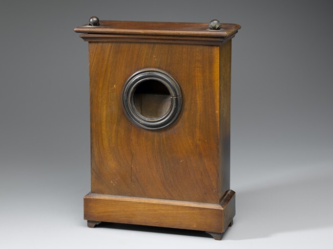 Houten horlogestander, ingelegd met notenhout, in de vorm van rechthoekige kast op vier pootjes