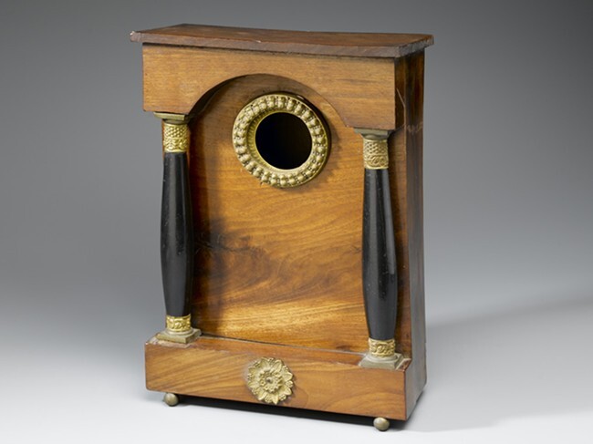 Tafelklokje van eikenhout met twee zwarte pilaren en op vier koperen bolpootjes