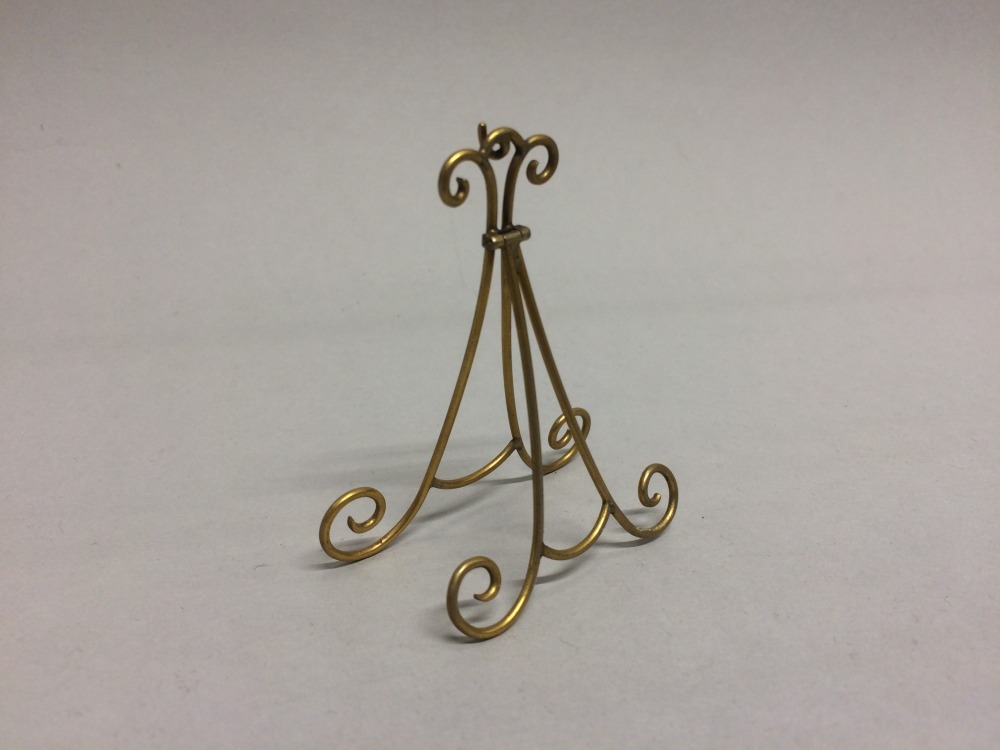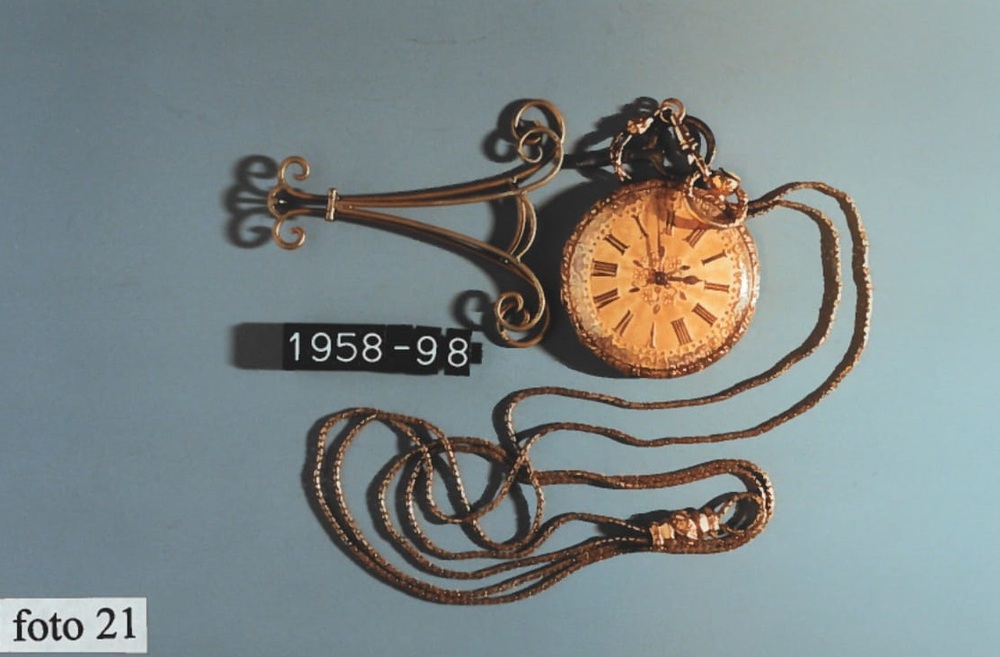Standertje behorende bij gouden horloge, onderdeel van horloge met ketting, geel koperen standertje en sleuteltje