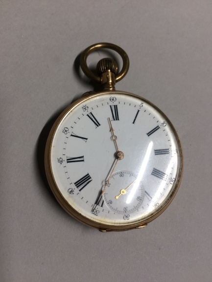 Rond plat horloge met wit geëmailleerde wijzerplaat met tijdaanduiding in zwart met Romeinse en Arabische cijfers