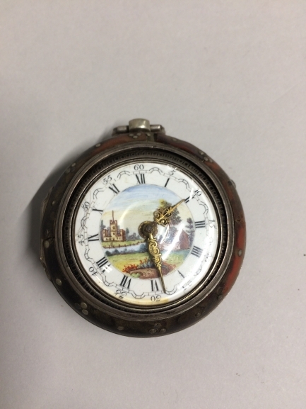 Horloge in zilveren kast en losse zilveren buitenkast met schildpad