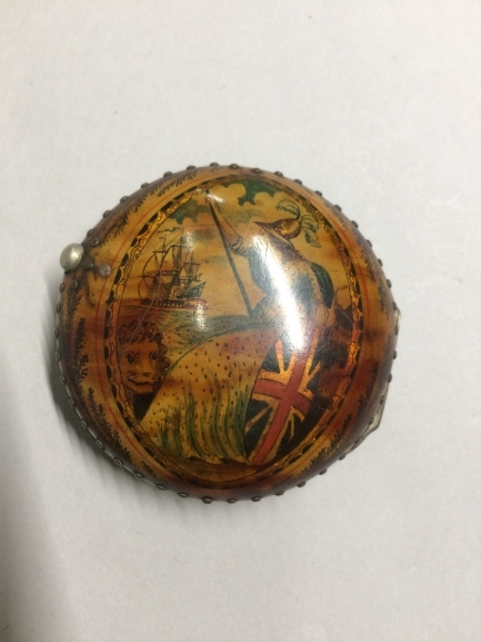 Ronde iets bolvormige buitenkast van een horloge met op het schildpad aan de achterzijde beschilderd in ovaal Brittannia en driemaster.