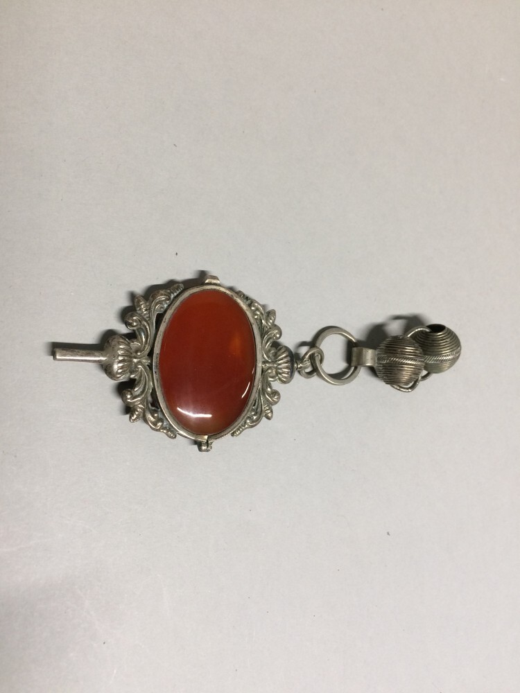Zilveren horlogesleutel met in greep, in zilveren zetting een roodbruine steen