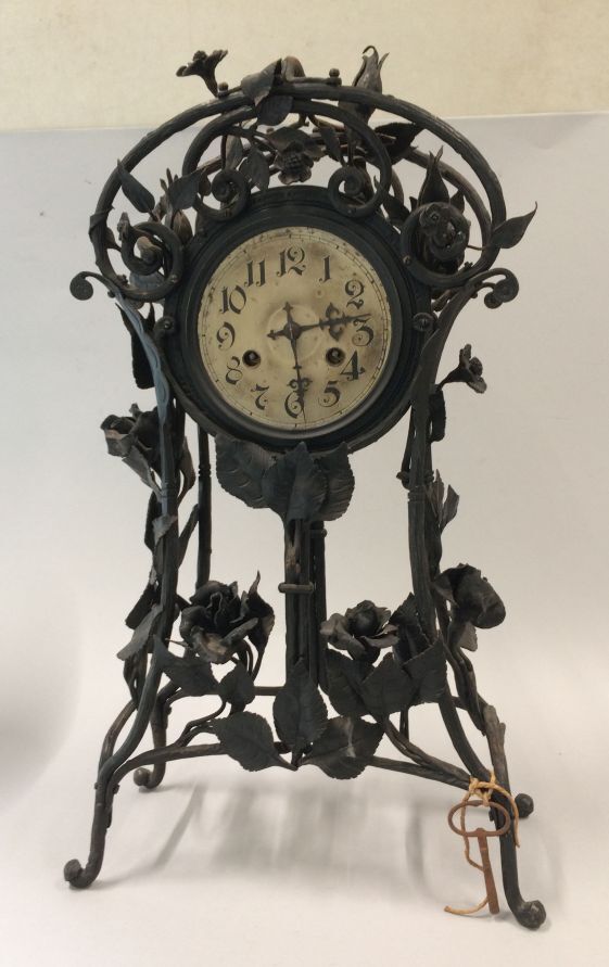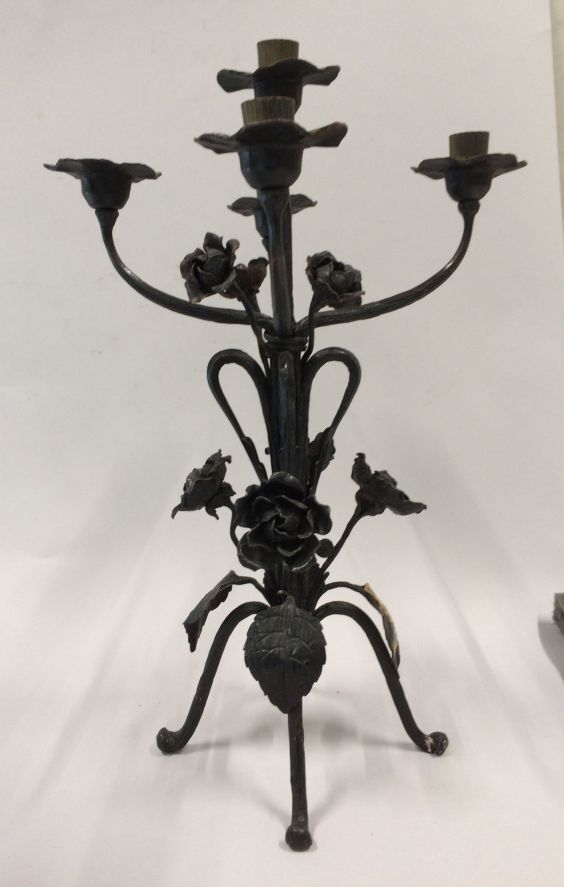 Kandelaar, onderdeel van klok met losse klepel en twee kandelaren met bloemen en bladeren