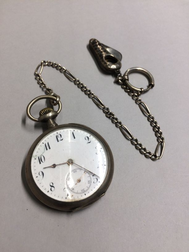 Zilveren horloge aan horlogeketting en met sigarenknipper