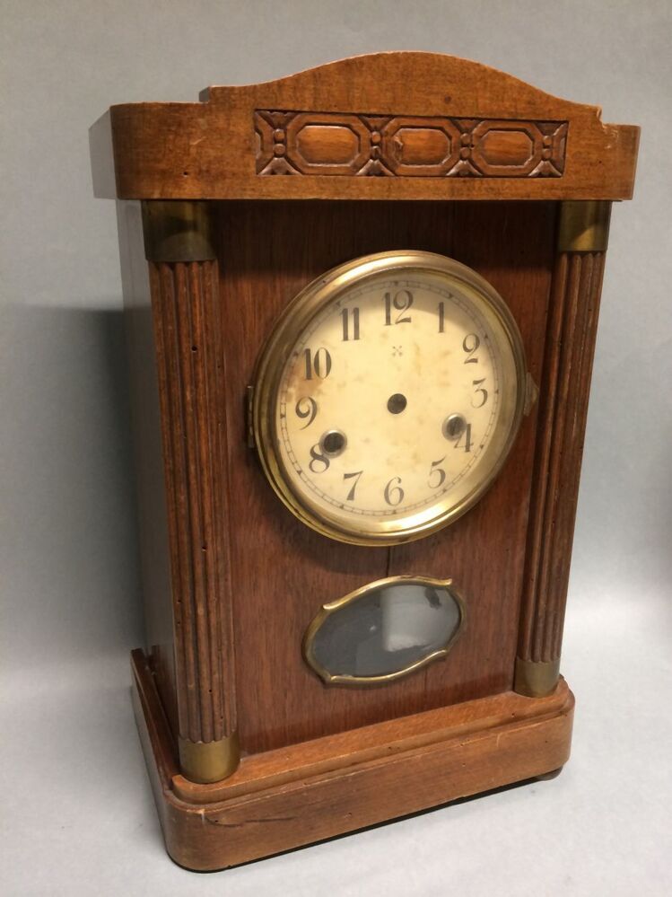 Wordt gebruikt voor klokken die zijn ontworpen om op schoorsteenmantels te staan en die meestal gedrongen en zwaar zijn en geen handvatten hebben. (AAT-Ned) https://data.cultureelerfgoed.nl/term/id/cht/34b253f6-e79d-44bb-a34f-d7a65ef94073